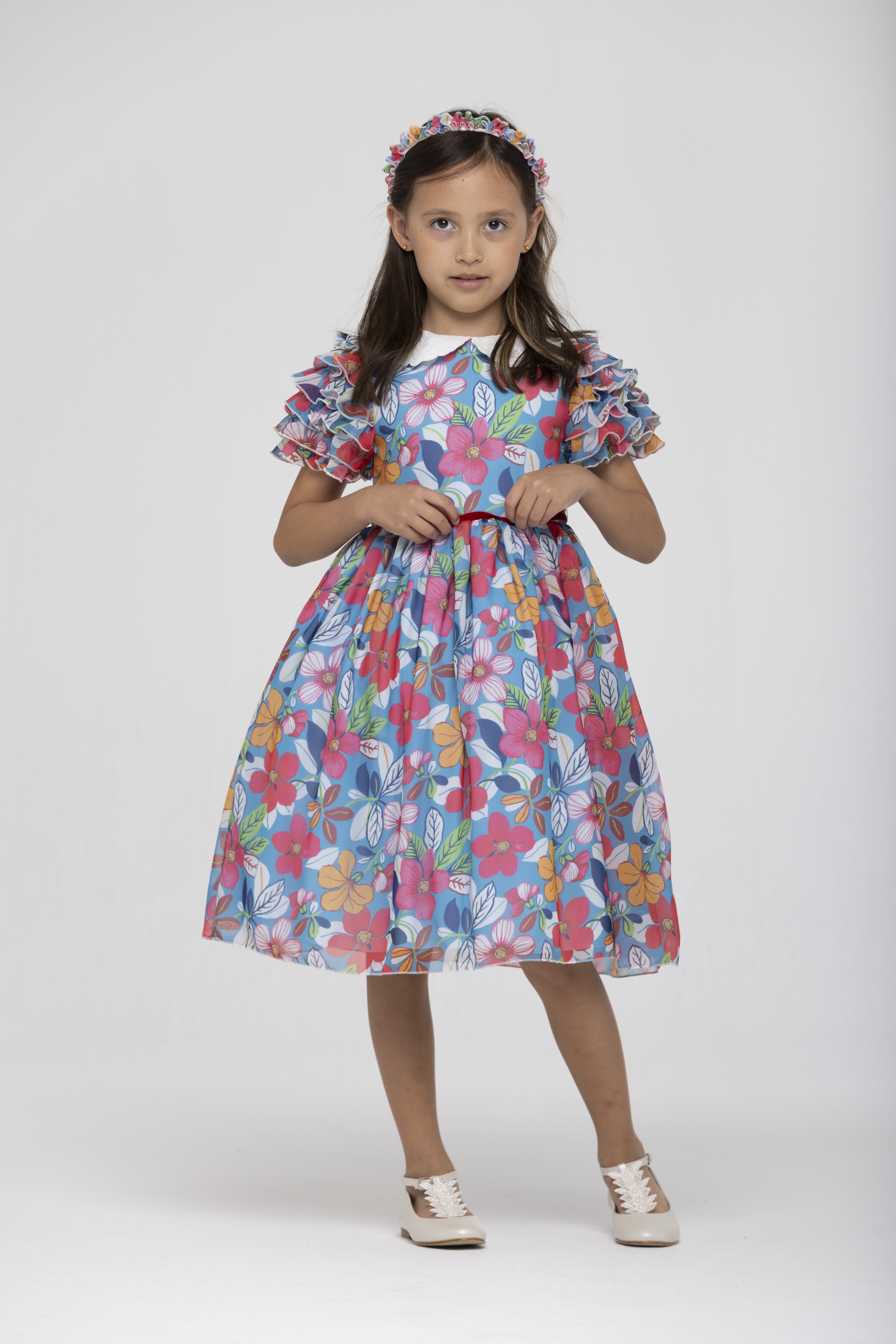 Girls floral printed chiffon dress. It has lace embroidery collar off white logo.
