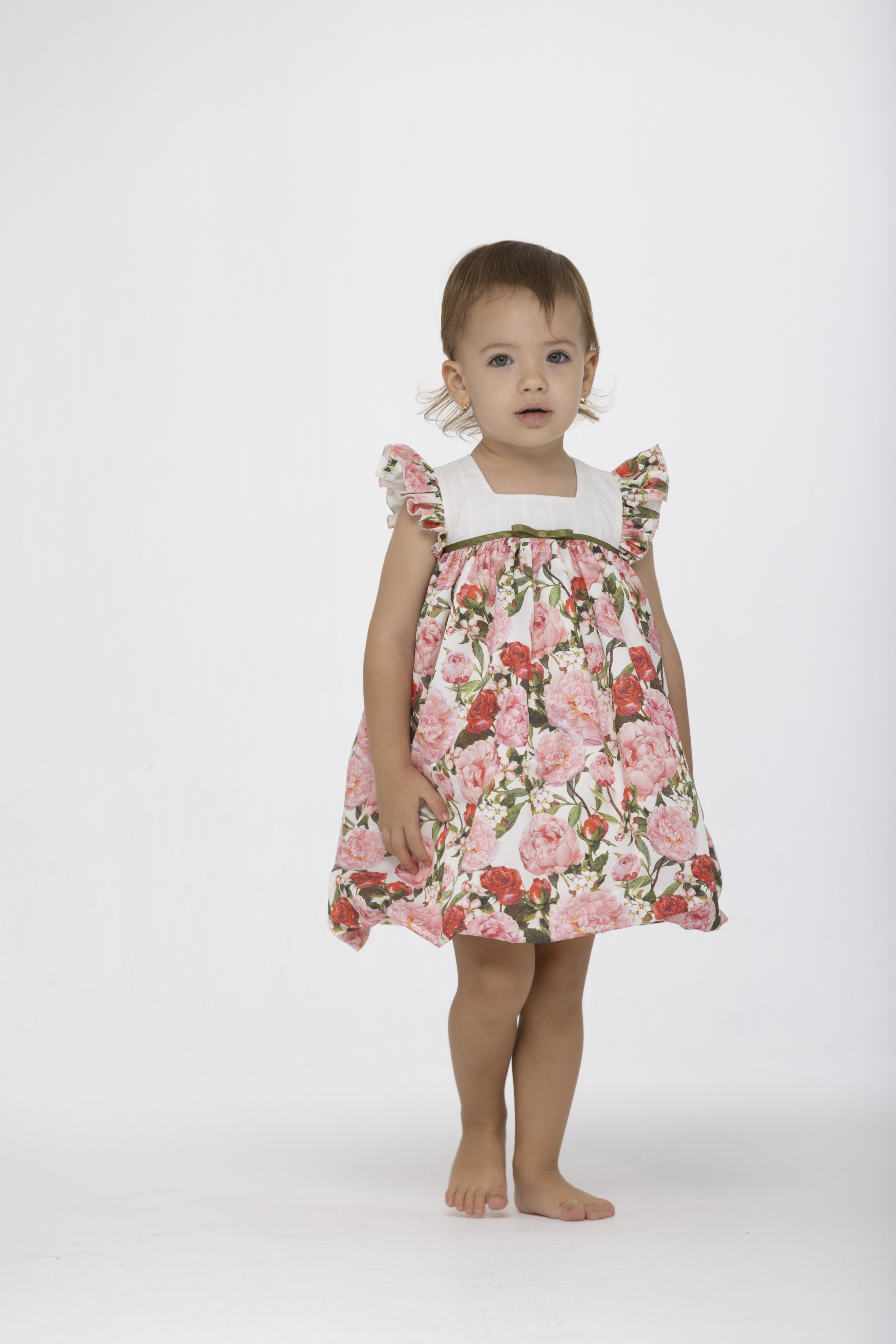 Girls stunning in any occasion dress in pink floral by Speranza. Made in cotton and there is a green ribbon in the middle. It has a soft cotton lining and it fastens with a zip on the back.