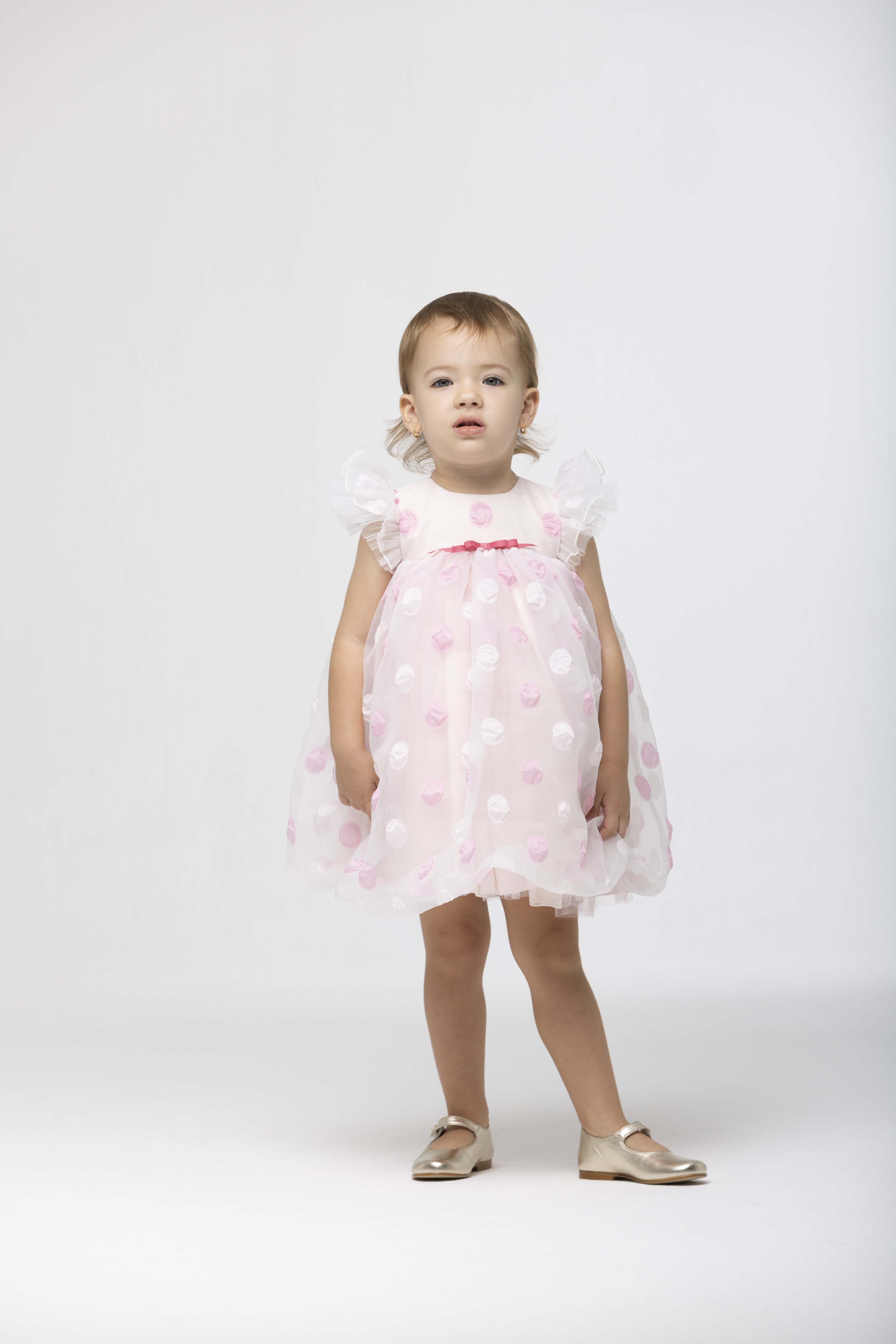 Off-white organza dress for baby girls by Speranza .It has Pink polka-dot baby dress with butterfly sleeves. Fully lined in soft, lightweight cotton.