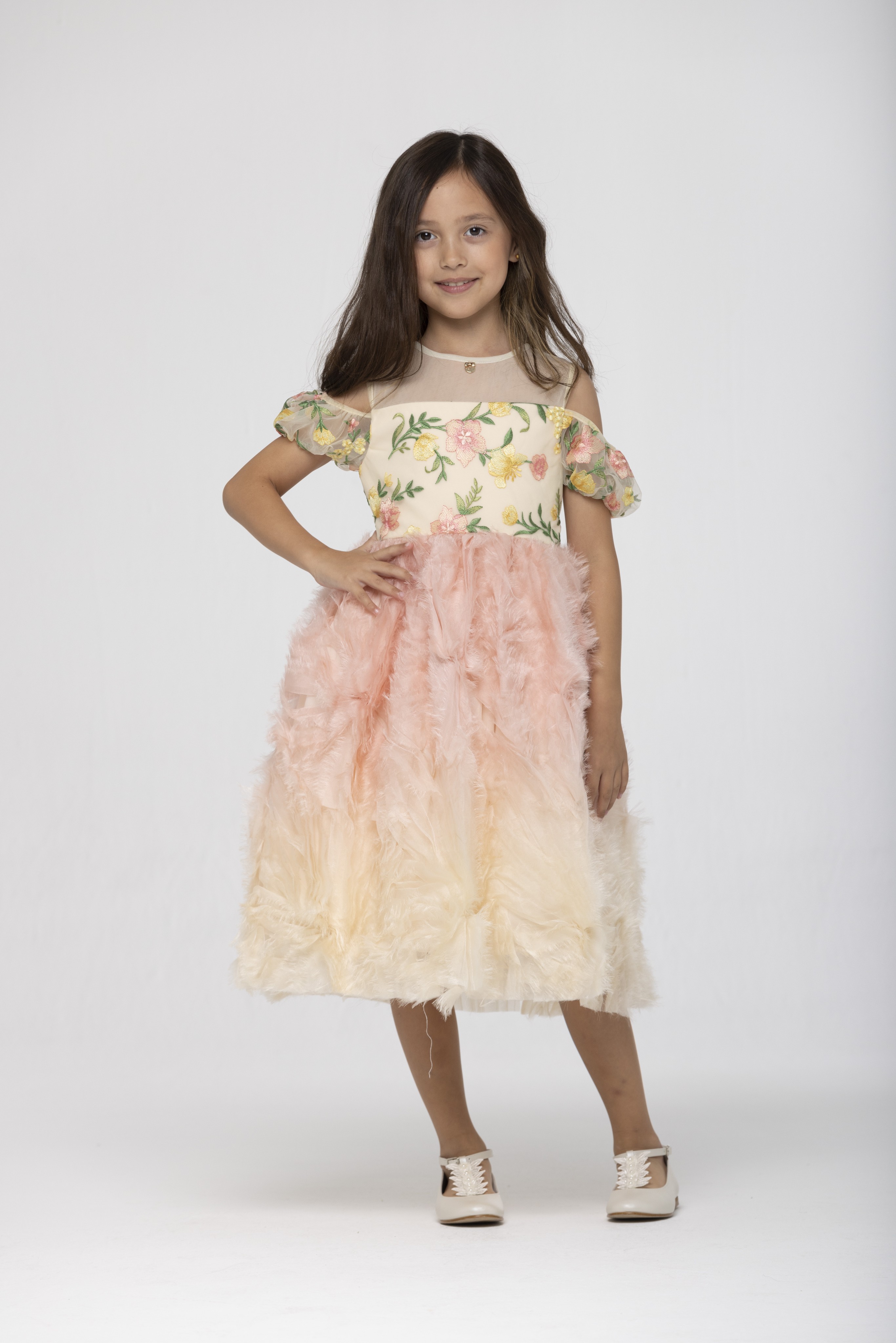 Speranza girl dress is made of organza body and the pink and beige tiered organza skirt is adorable for your kids.